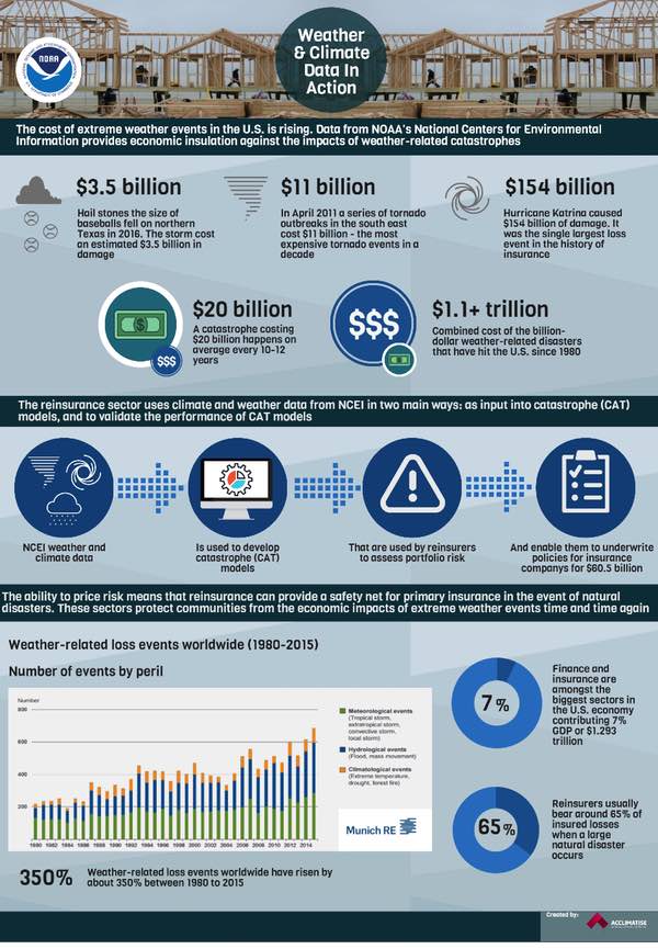 “While difficult to quantify its direct value to the sector, [National Centers for Environmental Information] NCEI’s data is the backbone for many transactions in the reinsurance industry and without it billions of dollars of economic activity would be lost,” said a report in December by the National Oceanic and Atmospheric Administration (NOAA).