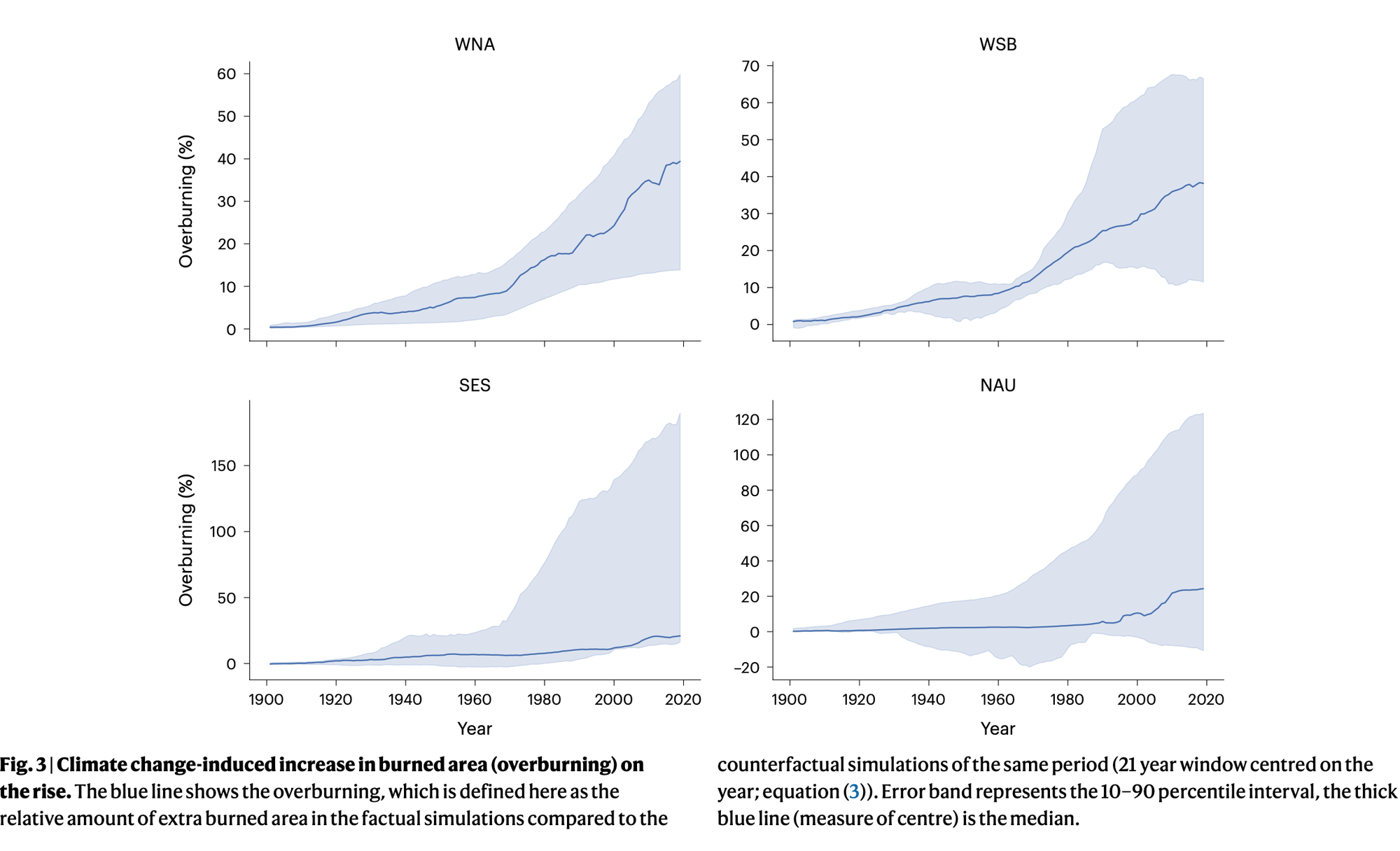 Central Australia was identified as a hotspot for increased burned area, experiencing a rise of 22.4% due to climate change. Similar trends were observed in southeastern South America (28.9%), West Siberia (17.5%), and western North America (14.9%).