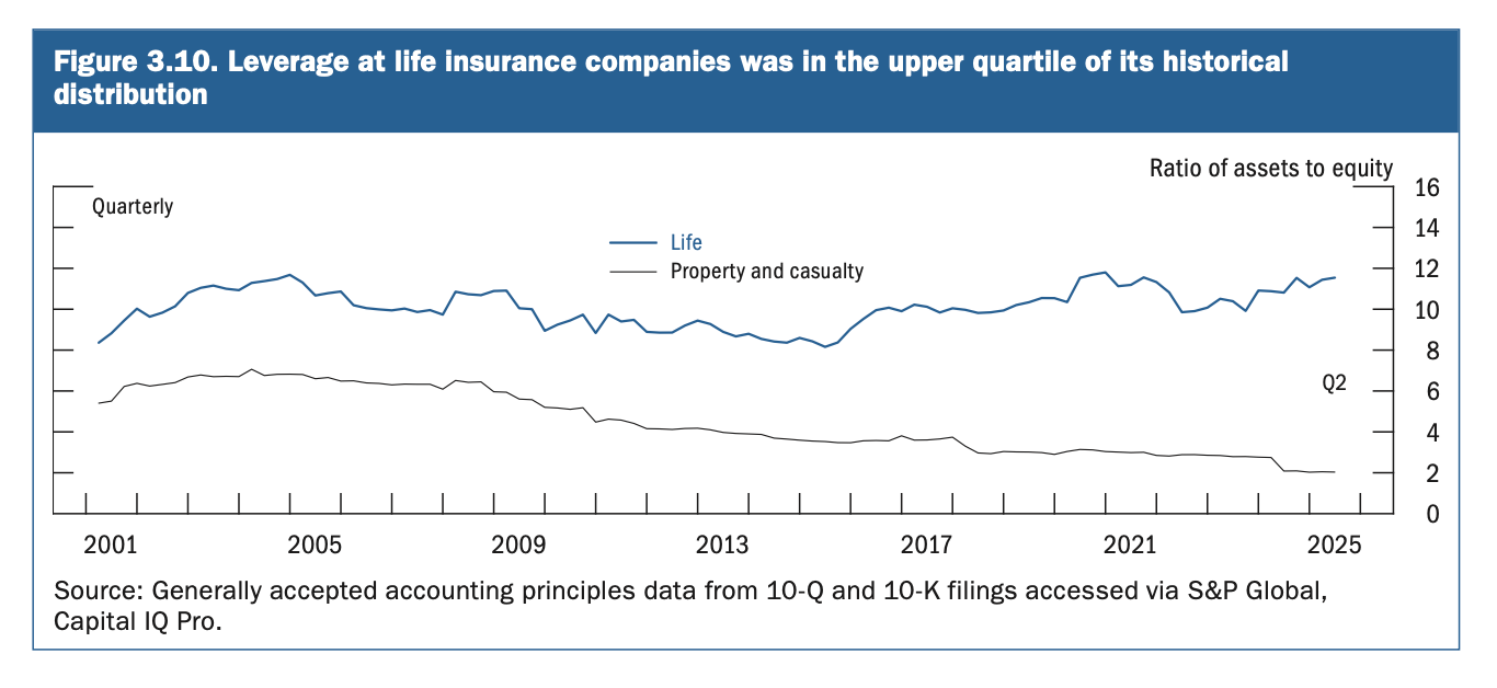 The Fed’s latest Financial Stability Report, released last week, said the sector’s leverage “remained in the upper quartile of its historical distribution” through the first half of 2025. The report also warned that vulnerabilities tied to leverage across nonbank financial institutions, including insurers, “remain notable.”\