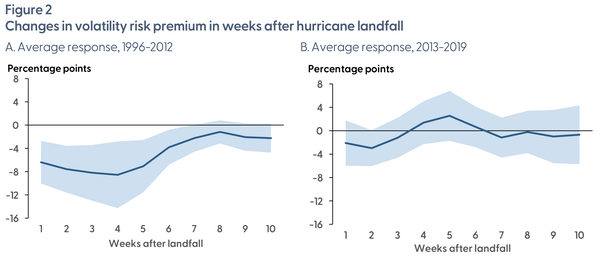 According to the data, the typical post-hurricane landfall volatility risk premium was negative prior to Sandy and represented investor “under reaction” to hurricanes. But in the decade since Hurricane Sandy, the typical post-hurricane landfall volatility risk premium is higher indicating that investors are more cautious about hurricane impacted equities.